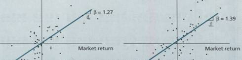 систематичного ризику (β=+1,27 та β=+1,39) для доходів двох різних цінних паперів (вісь ординат), відносно доходу диверсифікованого портфелю цінних